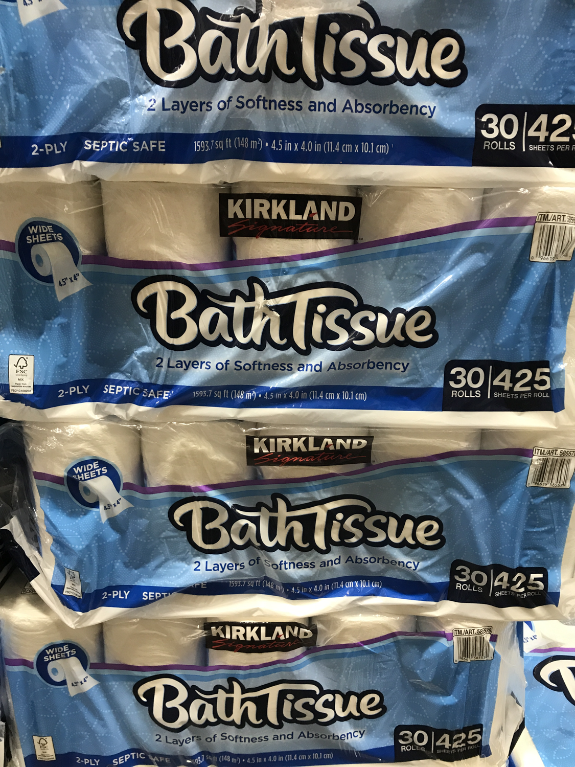 2 layers of softness and absorbency; Each sheet is 4 in x 4.5 in. Kirkland signature 2 ply bath tissue, 30 ct, 425 sheets · case pack of 30 rolls · 425 sheets per roll · 2 layers of softness and absorbency · each sheet is 4 in x . Like the large 425 sheet rolls and 30 roll. Case pack of 30 rolls;