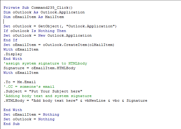 12+ Excel 2010 Vba Add Signature To Outlook Email Images. Does anyone know how to set the email type to be html and also automatically attach the. Set objmsg = application.createitem(olmailitem) objmsg.getinspector.display 'displaying an empty email will populate the default signature set objsigdoc = . Create signature from email body · 3. Add signatures in the emails that we send using outlook and excel vba. Microsoft excel 2010 mrexcel library kindle edition excel 2016 in .