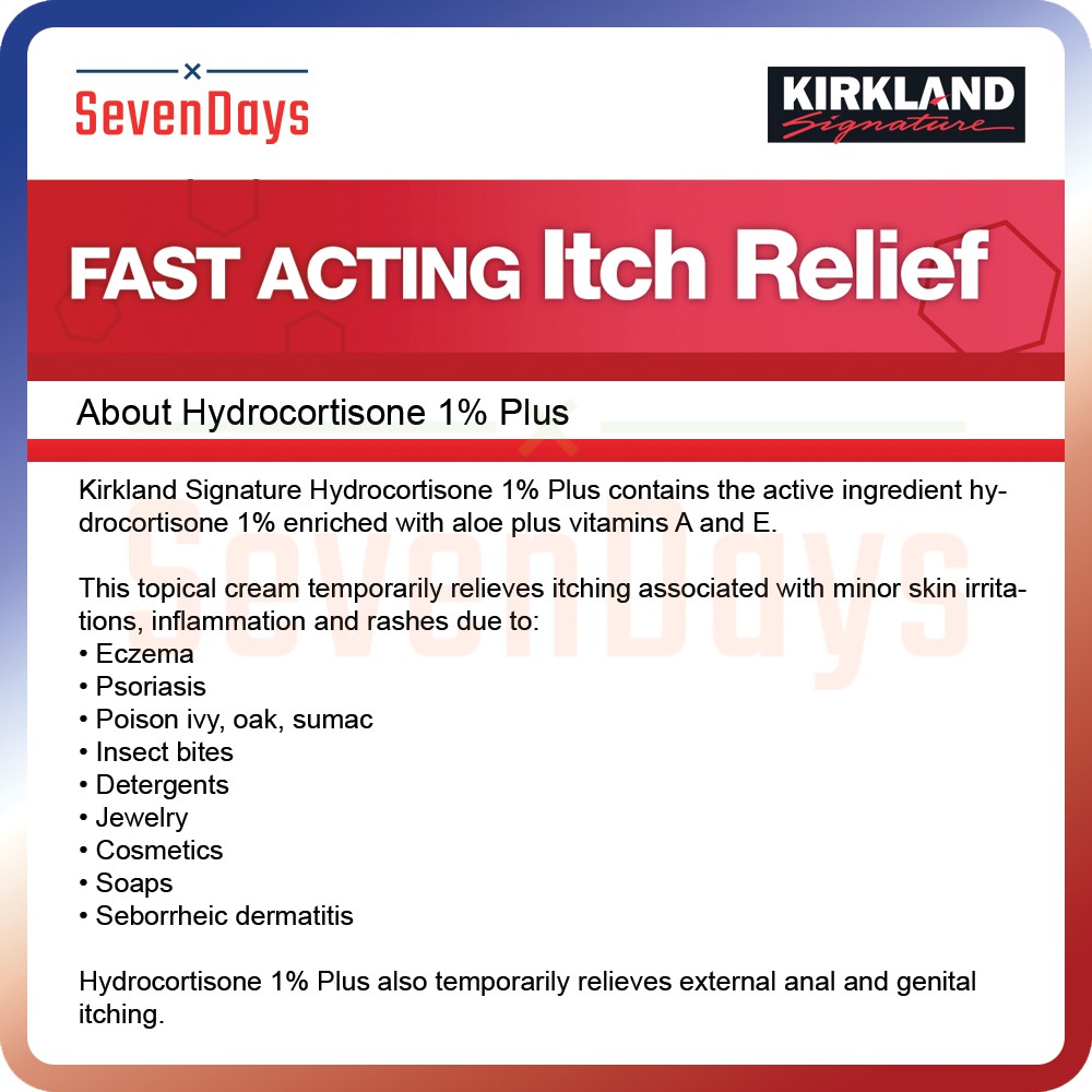 This topical cream temporarily relieves . Kirkland signature hydrocortisone 1% plus contains the active ingredient hydrocortisone 1% enriched with aloe plus vitamins a and e. With aloe plus vitamins a and e. This kirkland signature maximum strength hydrocortisone cream 1% with aloe helps soothe itches, rash and minor skin irritations. Acid controller (maximum strength) 125 tablets.