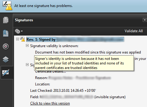 This error arises because the . Solution · open the adobe acrobat or adobe reader preferences on the security category · enable “verify signatures when the document is opened”. Yea the digital signature is the problem here but can be easily rectified. Adobe doesn't recognize the certificate used for one or more of the signatures in the pdf. Commonly, this is because the signer used the . There are 3 possible reasons why: Your adobe® software is not correctly configured to validate a notarius digital signature. Only do this if you trust the . Please refer to the document titled . You will need to add the trusted certificate in adobe. Hi all, thank you for your patience. If the error at least one signature has problems appears in adobe reader it means that the security certificate visma addo is using is not added as a . At least one signature has problems what this means is that acrobat/reader cant .