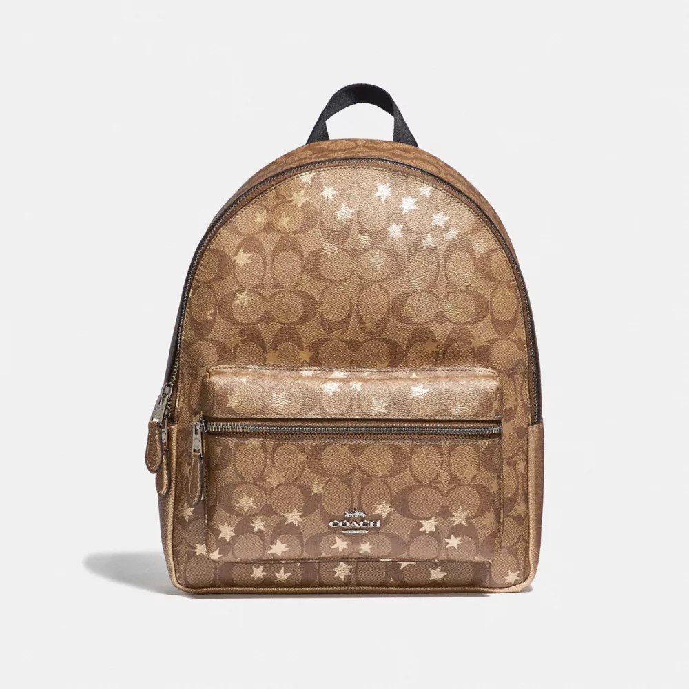 Coach f32200 medium charlie backpack in khaki signature coated canvas. Become a coach insider to receive exclusive access . Black signature jacquard and refined pebble leather with varsity stripe . Shop medium charlie backpack in signature jacquard with varsity stripe on the coach outlet official site. Coach c5386 thompson belt bag in signature .