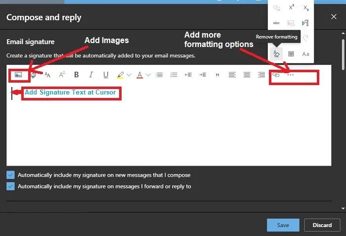 Enter either a generic signature that could be used for all email accounts tied to your outlook app, or a specific signature, per account signature, .