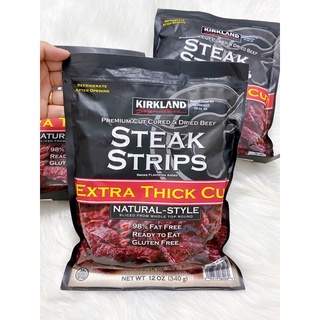 Just the right amount of chew. Kirkland signature premium beef steak strips jerky 12 oz (2pak). Extra thick cut smoke flavoring added good source of protein . 300g steak jerky thick beef strips high protein dried beef. They are great for a little energy boost.