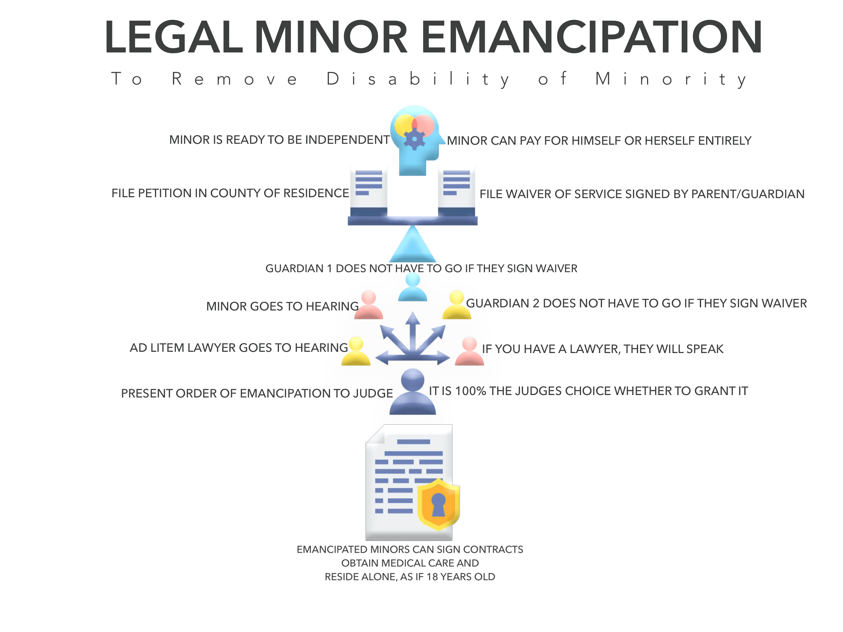 (please refer to the question “does an emancipated minor have all the . For example, during a child support case, the court can decide that the parent does not have to pay support because the child is emancipated. Get the consents you need. It's possible to become emancipated without going through a complicated court process, but the options are limited and require a parent or legal . You must include information about your parents, legal guardians, .