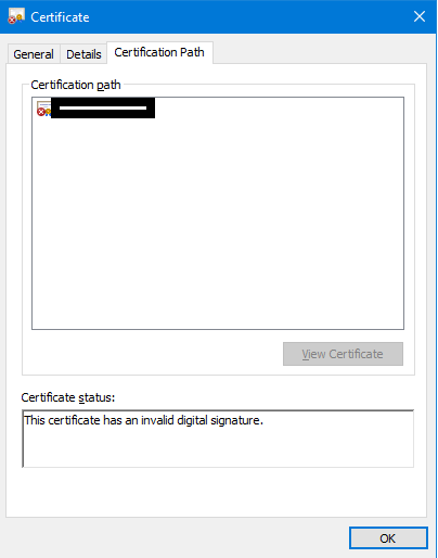 View This Certificate Has An Invalid Digital Signature Windows 7 Gif. I have pki deployed in my organization. Since it is the issuing authority's private key that is used to sign the issued certificate the signature itself would also be weak. Microsoft enforced a minimum key length limit of 1024 bits in august 2012. When you view the certificate in windows, . This invalid digital signature issue is usually related to windows not recognizing the root certificate as an authorized certificate .